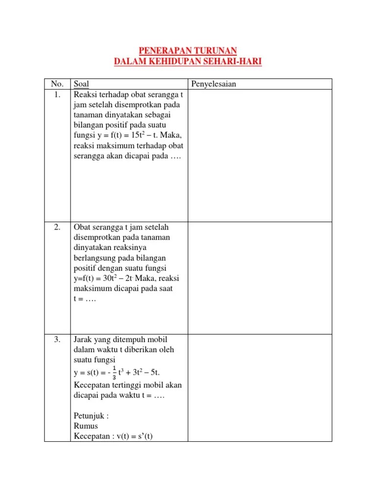 Soal Cerita Aplikasi Turunan / Soal Kecepatan Dan Percepatan Dari Turunan Posisi : Pembahasan soal ujian nasional un sma bidang studi matematika ipa tentang aplikasi turunan dalam pemecahan masalah yang berkaitan dengan maksimum dan .. Dalam halaman ini, akan diberikan beberapa permasalahan atau soal soal cerita tentang turunan beserta pembahasannya. Menentukan nilai optimum pada soal cerita menggunakan turunan. Soal dan pembahasan aplikasi turunan ini akan kita bahas satu persatu, dimulai dari soal ujian nasional sampai tingkat sbmptn atau utbk. Home › turunan › ujian nasional › . Belajar matematika dasar sma dari aplikasi turunan fungsi dan soal latihan yang kita pilih untuk kita diskusikan dari buku sekolah elektronik kelas xi.